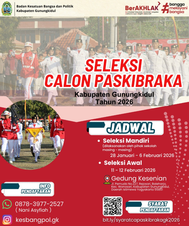 Badan Kesatuan Bangsa dan Politik (Kesbangpol) Kabupaten Gunungkidul resmi membuka seleksi Calon Paskibraka Kabupaten Gunungkidul Tahun 2026. Seleksi ini menjadi kesempatan bagi putra-putri terbaik tingkat SMA/sederajat se-Kabupaten Gunungkidul untuk bergabung dalam Pasukan Pengibar Bendera Pusaka (Paskibraka) pada 2026.