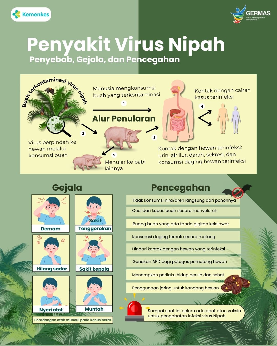 - Konsumsi buah atau produk buah yang terkontaminasi air liur kelelawar, seperti nira kurma mentah